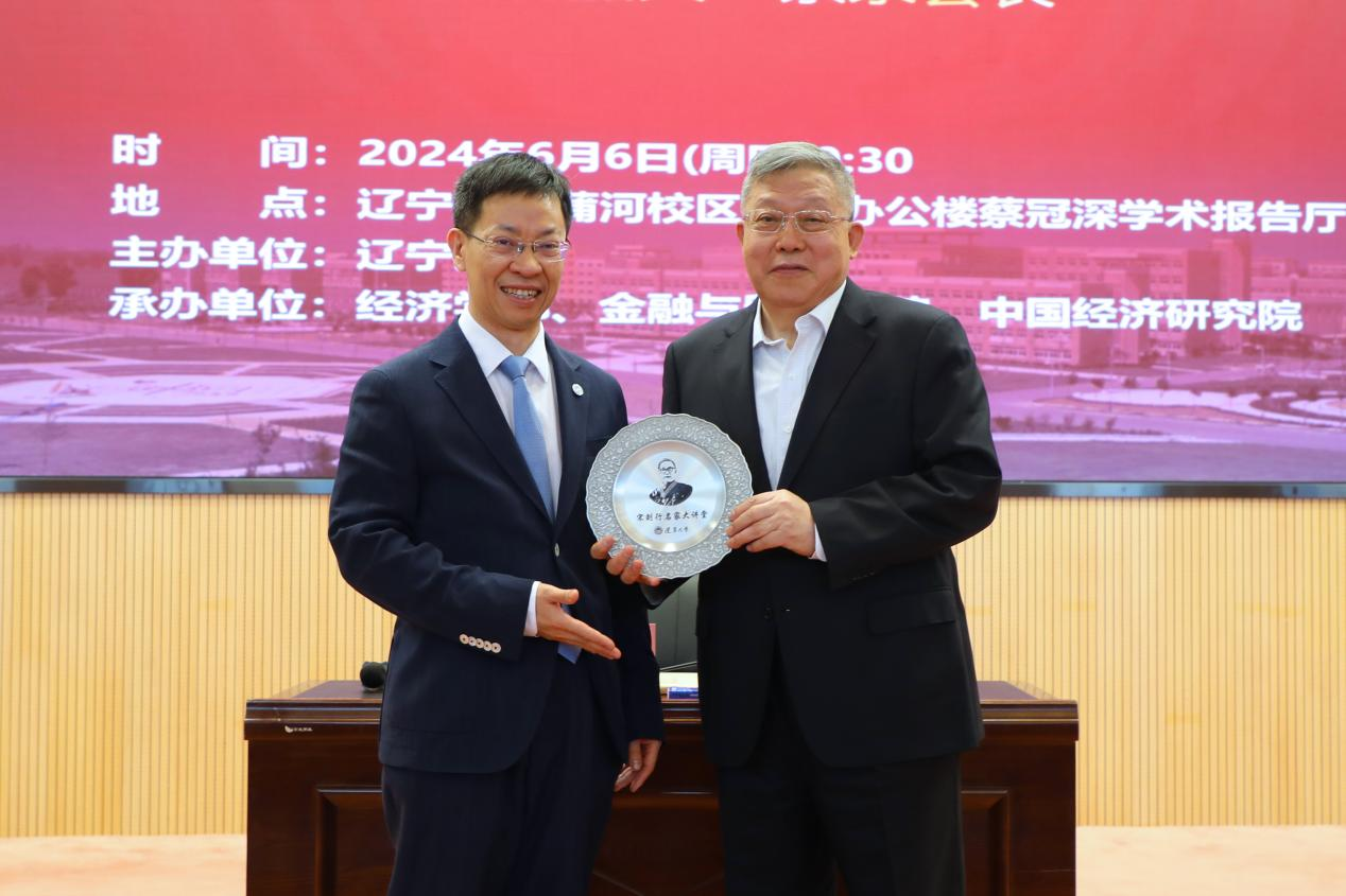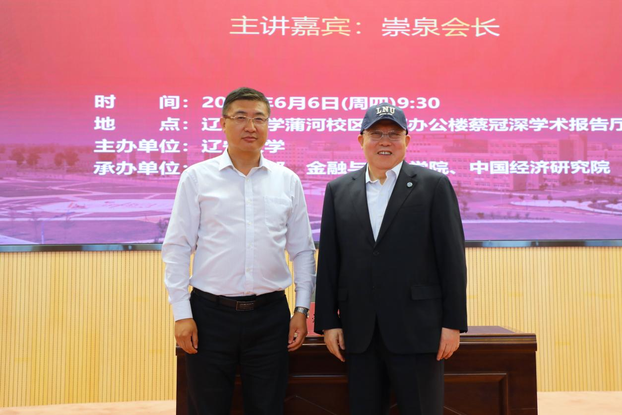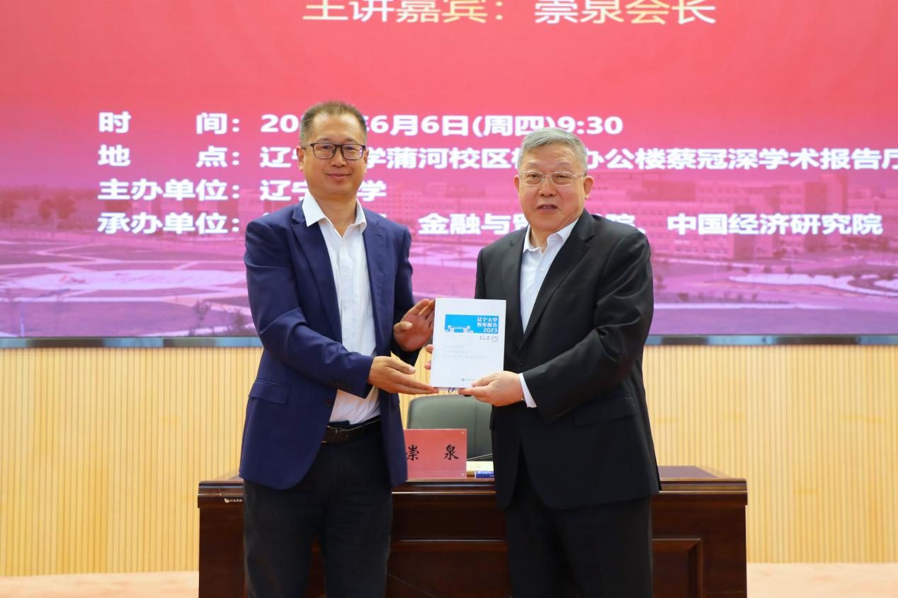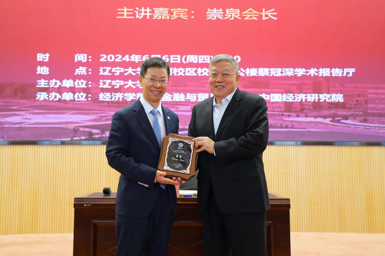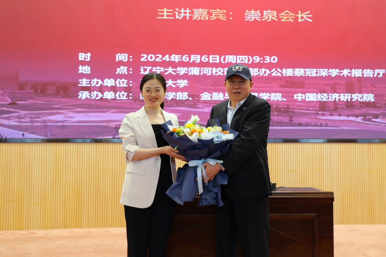报告结束后,余淼杰校长代表太阳集团为崇泉会长颁发宋则行名家大讲堂纪念盘和太阳集团终身名誉教授聘书,李安民经济研究院院长姚树洁教授为崇泉会长赠送纪念U盘,太阳成集团tyc151cc副主任王伟光教授为崇泉会长赠送《太阳集团智库报告》,《太阳集团学报》编辑部主任刘钧霆教授为崇泉会长佩戴校徽、赠送校帽,金融与贸易学院教师代表耿丽平老师为崇泉会长献花。