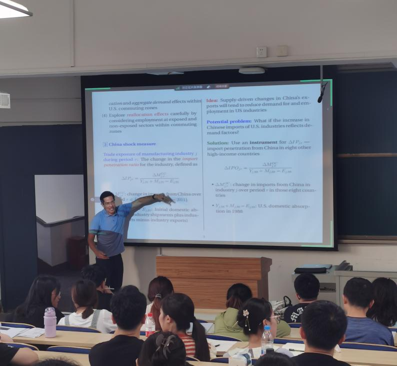 课堂上,安东尼奥教授以一篇聚焦于中国经济增长对美国就业市场影响的顶级期刊论文为蓝本,巧妙解构了衡量中国贸易敞口的精密方法,细致入微地引领大家探索了论文背后的计量工具和回归结论,展示了研究的严谨架构与深邃洞察。课程逻辑严密、内容详实,有效增进了师生对实证分析的纵深思考。150余名师生选修或旁听了这门课程。