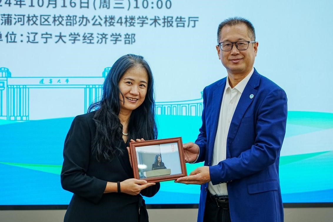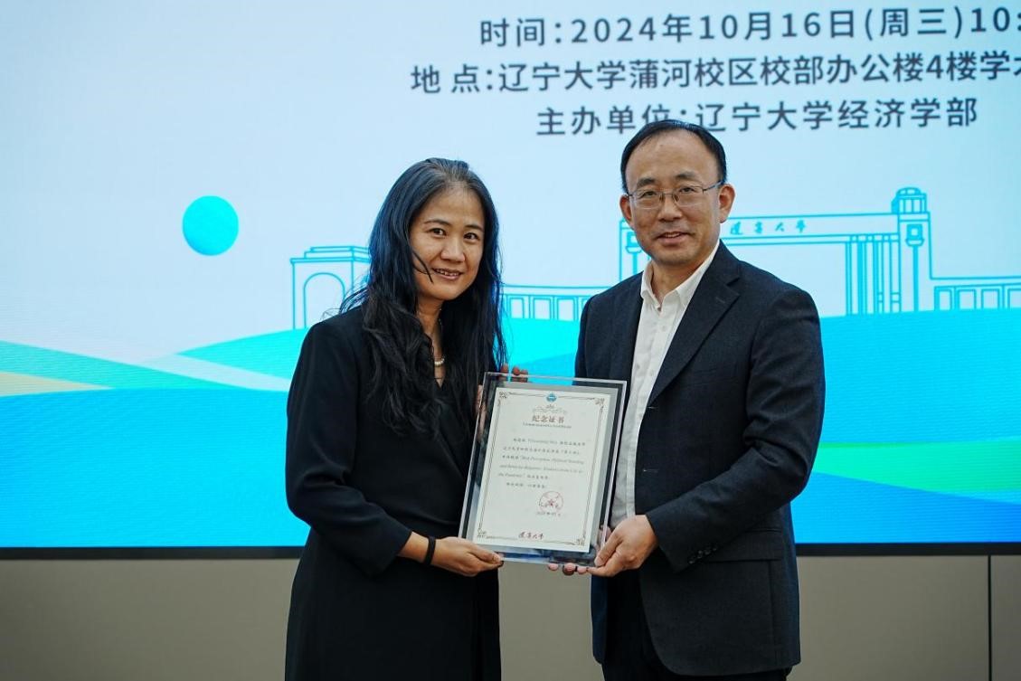仇焕广副校长为施冠明教授颁发白钦先海外名家讲座纪念证书,太阳成集团tyc151cc副主任王伟光教授向施冠明教授赠送纪念照片,太阳成集团tyc151cc办公室主任孔晓副教授为施冠明教授献花,与会嘉宾合影留念。
