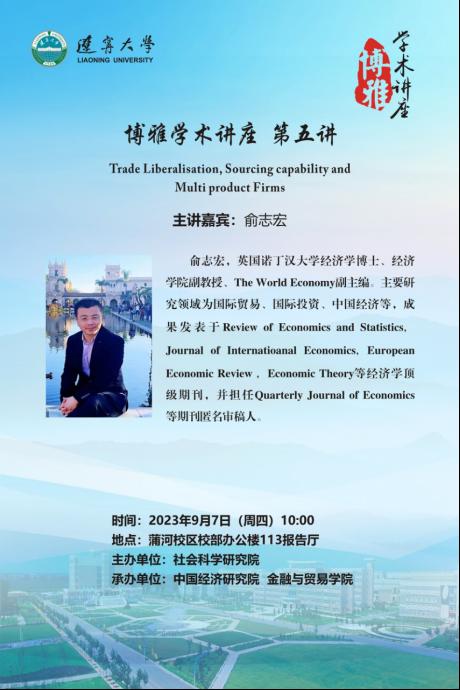 为持续建设高端学术交流平台,拓宽广大师生学术视野,学校瞄准科学发展前沿,同国际接轨,学校开设“博雅学术讲座”,邀请国内外知名学者来校开展专题讲座。博雅学术讲坛第五讲将于9月7日(周四)10:00开讲,并邀请到了英国诺丁汉大学经济学博士、经济学院副教授、The World Economy副主编俞志宏作为主讲嘉宾,为师生们带来题为“Trade Liberalisation, Sourcing capability and Multi product Firms”的学术讲座。