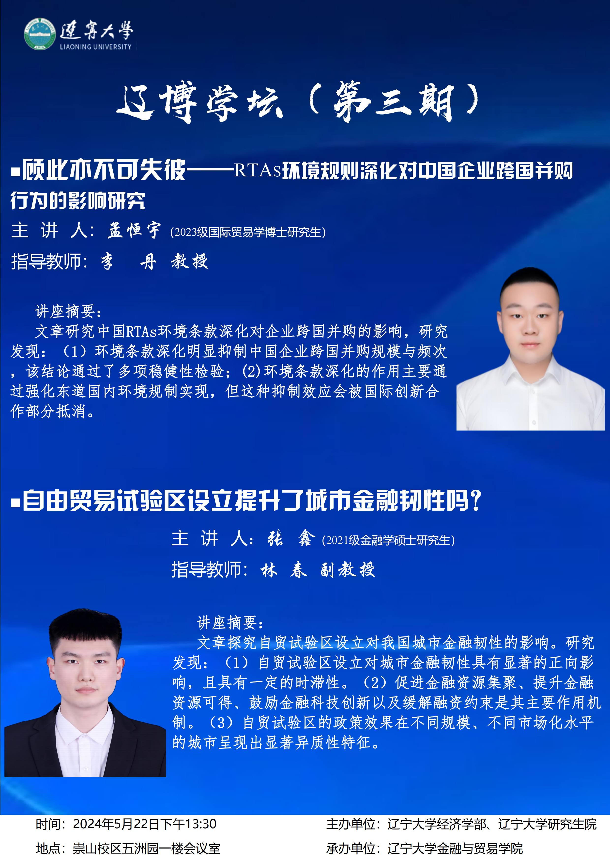 讲座摘要:文章研究中国RTAS环境条款深化对企业跨国并购的影响,研究发现:(1)环境条款深化明显抑制中国企业跨国并购规模与频次,该结论通过了多项稳健性检验;(2)环境条款深化的作用主要通过强化东道国内环境规制实现,但这种抑制效应会被国际创新合作部分抵消。