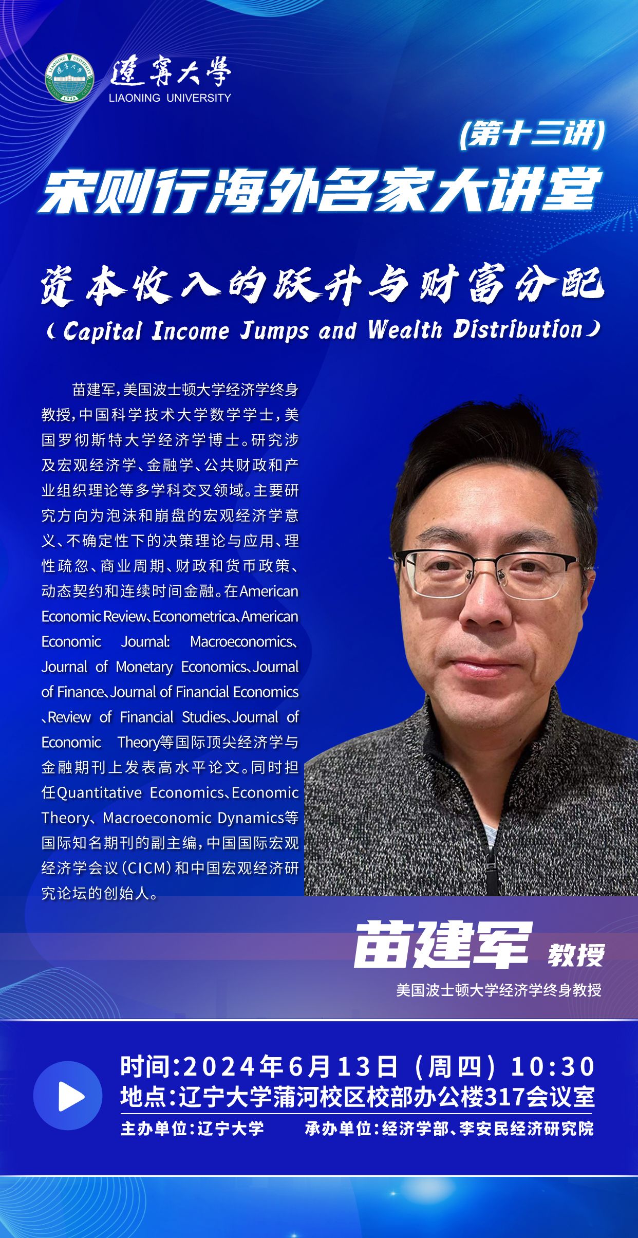 苗建军,美国波士顿大学经济学终身教授,中国科学技术大学数学学士,美国罗彻斯特大学经济学博士。研究涉及宏观经济学、金融学、公共财政和产业组织理论等多学科交叉领域。主要研究方向为泡沫和崩盘的宏观经济学意义、不确定性下的决策理论与应用、理性疏忽、商业周期、财政和货币政策、动态契约和连续时间金融。在American Economic Review、Econometrica、American Economic Journal: Macroeconomics、Journal of Monetary Economics、Journal of Finance、Journal of Financial Economics、Review of Financial Studies、Journal of Economic Theory等国际顶尖经济学与金融期刊上发表高水平论文。同时担任Quantitative Economics、Economic Theory、 Macroeconomic Dynamics等国际知名期刊的副主编,中国国际宏观经济学会议(CICM)和中国宏观经济研究论坛的创始人。