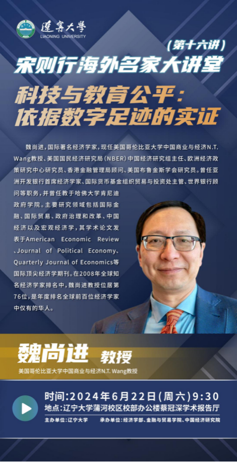 魏尚进,国际著名经济学家,现任美国哥伦比亚大学中国商业与经济N.T. Wang教授、美国国民经济研究局(NBER)中国经济研究组主任、欧洲经济政策研究中心研究员、香港金融管理局顾问、美国布鲁金斯学会研究员。曾任亚洲开发银行首席经济学家、国际货币基金组织贸易与投资处主管、世界银行顾问等职务,并曾任教于哈佛大学肯尼迪政府学院。主要研究领域包括国际金融、国际贸易、政府治理和改革、中国经济以及宏观经济学,其学术论文发表于American Economic Review、Journal of Political Economy、Quarterly Journal of Economics等国际顶尖经济学期刊。在2008年全球知名经济学家排名中,魏尚进教授位居第76位,是年度排名全球前百位经济学家中仅有的华人