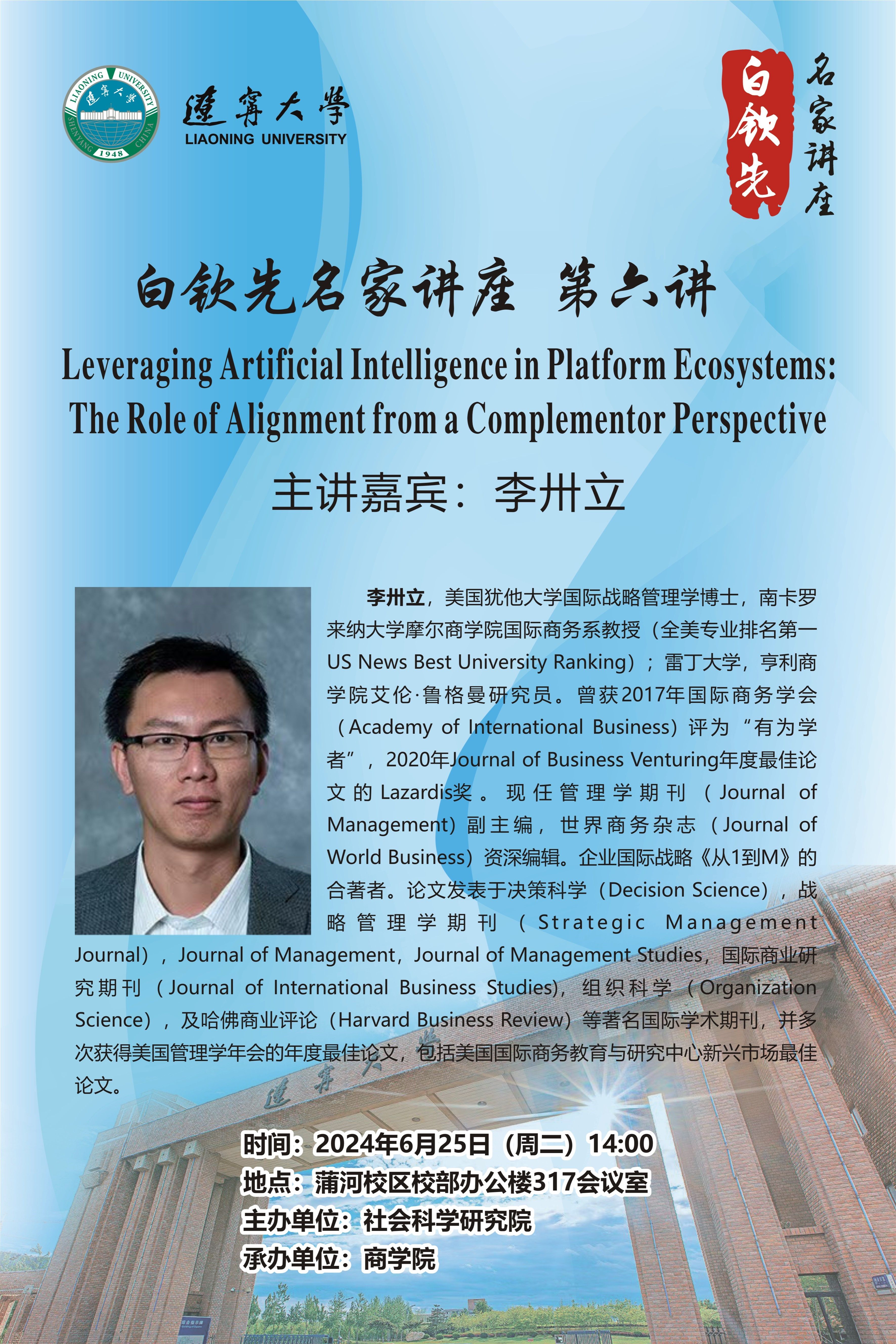 为持续建设高端学术交流平台,拓宽广大师生学术视野,学校瞄准科学发展前沿,同国际接轨,学校开设“白钦先名家讲座”,邀请国内外高学术水平经济类青年学者来校开展专题讲座。白钦先名家讲座第六讲将于6月25日(周二)14:00开讲,并邀请到了南卡罗来纳大学摩尔商学院国际商务系教授李卅立作为主讲嘉宾,为师生们带来题为“Leveraging Artificial Intelligence in Platform Ecosystems: The Role of Alignment from a Complementor Perspective”的学术讲座。