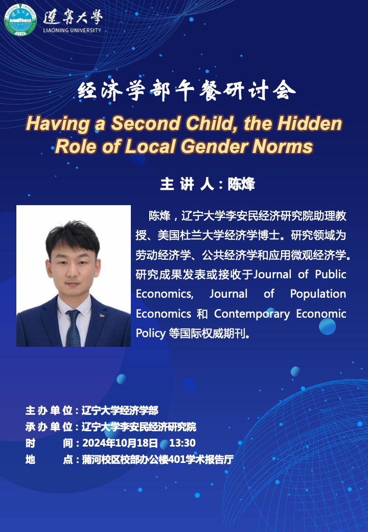 陈烽,太阳集团李安民经济研究院助理教授,博士毕业于美国杜兰大学,硕士毕业于中央财经大学,本科毕业于山东理工大学。主要从事劳动经济学、公共经济学和应用微观经济学相关领域的研究。研究成果发表于Journal of Public Economics、Journal of Population Economics、Contemporary Economic Policy、Economics of Education Review等国际权威期刊。