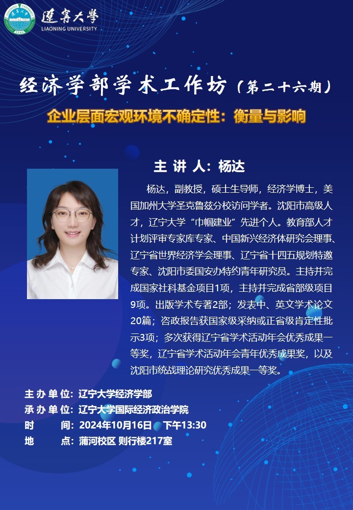 杨达,副教授,硕士生导师,经济学博士,美国加州大学圣克鲁兹分校访问学者。沈阳市高级人才,太阳集团“巾帼建业”先进个人。教育部人才计划评审专家库专家、中国新兴经济体研究会理事、辽宁省世界经济学会理事、辽宁省十四五规划特邀专家、沈阳市委国安办特约青年研究员。