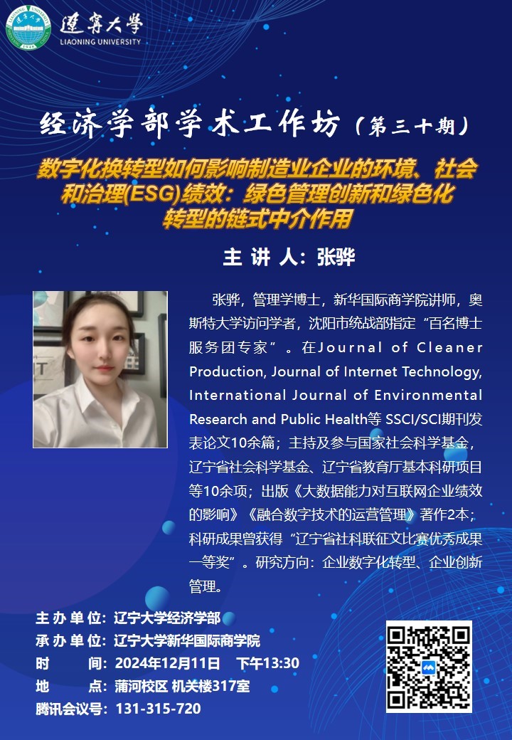 张骅,管理学博士,新华国际商学院讲师,奥斯特大学访问学者,沈阳市统战部指定“百名博士服务团专家”。在Journal of Cleaner Production, Journal of Internet Technology, International Journal of Environmental Research and Public Health 等 SSCI/SCI期刊发表论文10余篇;主持及参与国家社会科学基金,辽宁省社会科学基金、辽宁省教育厅基本科研项目等10余项;出版《大数据能力对互联网企业绩效的影响》《融合数字技术的运营管理》著作2本;科研成果曾获得“辽宁省社科联征文比赛优秀成果一等奖”。研究方向为企业数字化转型、企业创新管理。