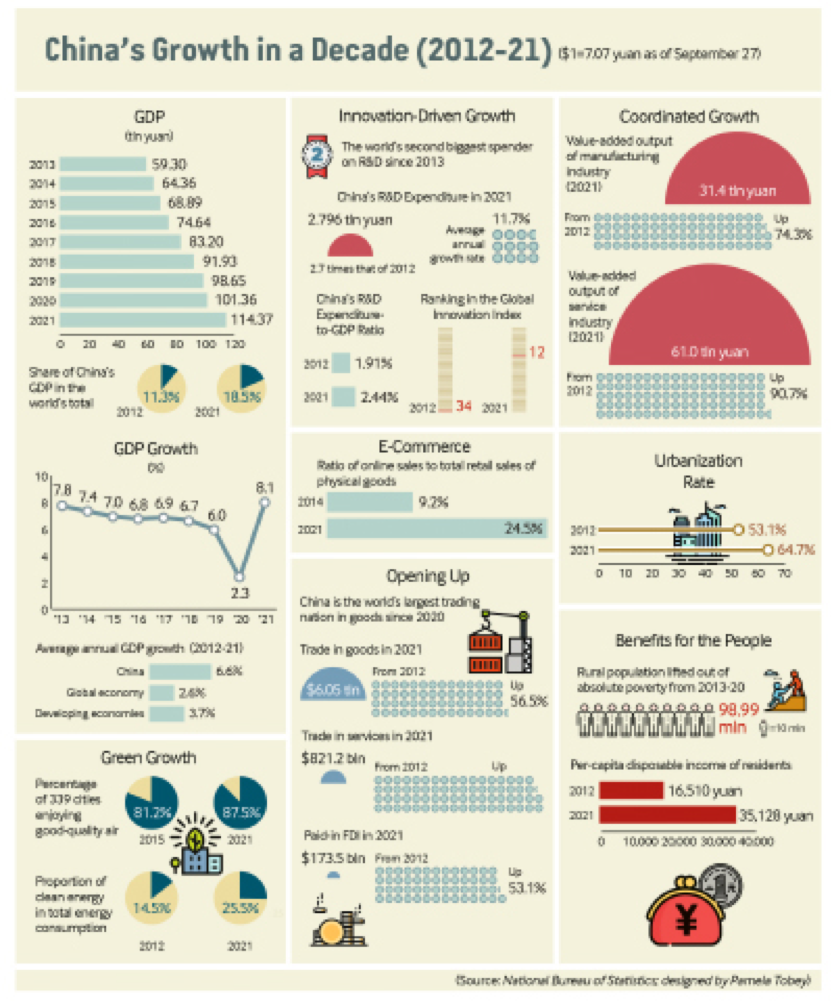 With its economic aggregate nearly doubling from 2013 to 2021, China has seen a decade of remarkable progress and has taken on a bigger role on the international stage. Throughout this period, China’s GDP expanded at an average annual rate of 6.6 percent, higher than the growth pace of 2.6 percent for the global economy and 3.7 percent for developing economies, a report from the National Bureau of Statistics (NBS) showed. Per-capita GDP hit 80,976 yuan ($11,684) in 2021, up 69.7 percent from 2012 — after allowing for inflation.