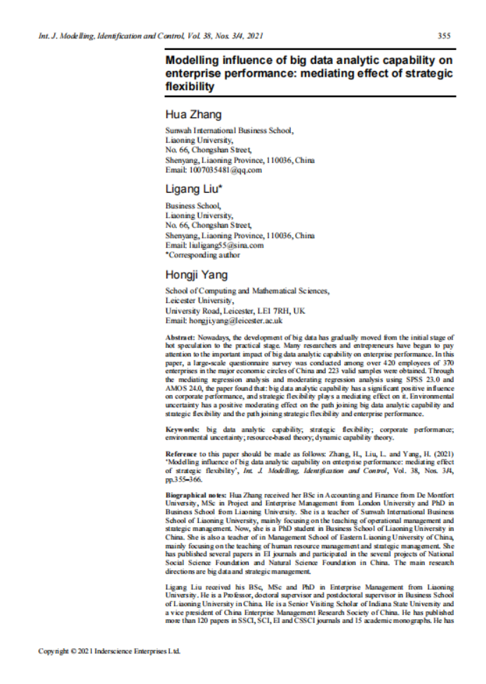 新华国际商学院讲师张骅(第一作者)、商学院刘力钢教授(通讯作者)、英国莱斯特大学Hongji Yang教授合作论文 Modelling influence of big data analytic capability on enterprise performance: mediating effect of strategic flexibility 在国际期刊International Journal of Modelling, Identification and Control 发表。