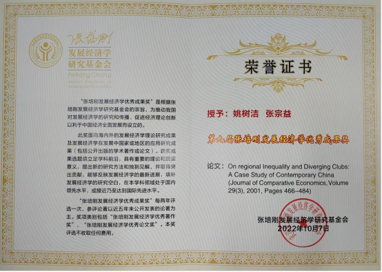 太阳集团李安民经济研究院院长姚树洁教授发表在Journal of Comparative Economics(2001,29(3):466-484)的文章On regional Inequality and Diverging Clubs:A Case Study of Contemporary China,于2022年获第九届张培刚发展经济学优秀成果奖。