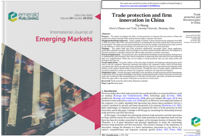 近日,金融与贸易学院黄涛副教授为独立作者的学术论文Trade protection and firm innovation in China被国际期刊International Journal of Emerging Markets接受并在线发表。