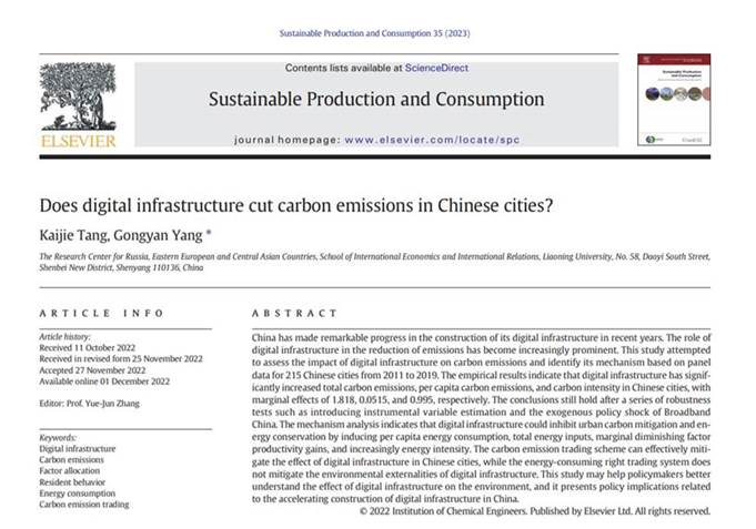 近日,国际经济政治学院杨攻研教授(通讯作者)与其指导的博士研究生唐凯洁共同完成的学术论文“Does digital infrastructure cut carbon emissions in Chinese cities?”在《Sustainable Production and Consumption》发表。