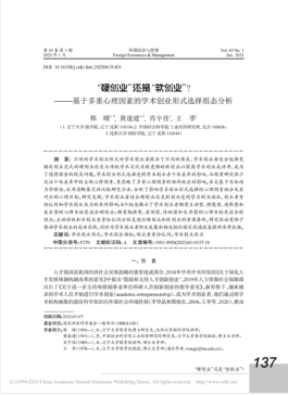 商学院王季教授作为通讯作者与博士研究生韩晴等共同完成的论文“‘硬创业’还是‘软创业’?——基于多重心理因素的学术创业形式选择组态分析”在《外国经济与管理》2023年第1期发表。