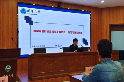 数学与统计学院祝志川教授应邀作了题为《数字经济引领高质量发展的统计测度与路径选择》的学术报告。报告首先介绍了高质量发展与绿色发展的背景,然后对数字经济测度、碳排放测算的现状进行分析,通过数字经济引领高质量发展的实证分析,最后提出数字经济的发展能够显著减少碳排放。报告过程中,与会师生围绕“数字经济”这一主题与祝志川教授进行了深入探讨,在热烈的交流中碰撞出前沿新知的思维火花。