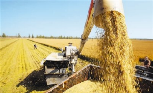图为在山东省临沂市郯城县郯城街道,农民将收获的水稻装车。