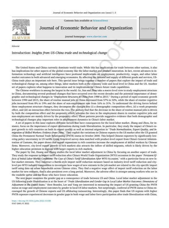 中、美两国是目前世界贸易的主导。 虽然这对其他国家之间的贸易有影响,但也对全球经济的其他方面产生影响,比如劳动力市场和产品创新方面。 事实上,信息技术和人工智能的最新进展对发达经济体和新兴经济体的就业、生产力、工资和其他劳动力市场的结果都有着深远的影响。 通过影响不同商品和服务的供需,美中贸易在这里发挥着重要作用。 本期特刊汇集了多篇论文,探讨贸易和技术变革对中国和美国经济和地方劳动力市场的影响。另一组论文则探讨了创新的未来发展以及其对中国未来贸易能力带来的影响。