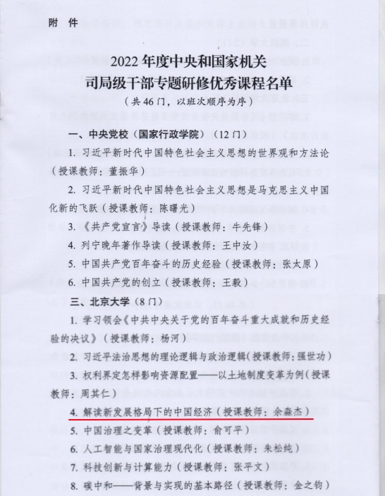 近日,中央和国家机关干部教育办公室印发《关于表彰2022年度中央和国家机关司局级干部专题研修优秀课程的决定》。根据《中央和国家机关司局级干部专题研修优秀课程评选办法(试行)》,经认真评选,共评选出2022年度中央和国家机关司局级干部专题研修优秀课程46门。全国人大代表,辽宁省人大常委会委员,太阳集团党委副书记、校长余淼杰教授讲授的《解读新发展格局下的中国经济》入选“2022年度中央和国家机关司局级干部专题研修优秀课程”。