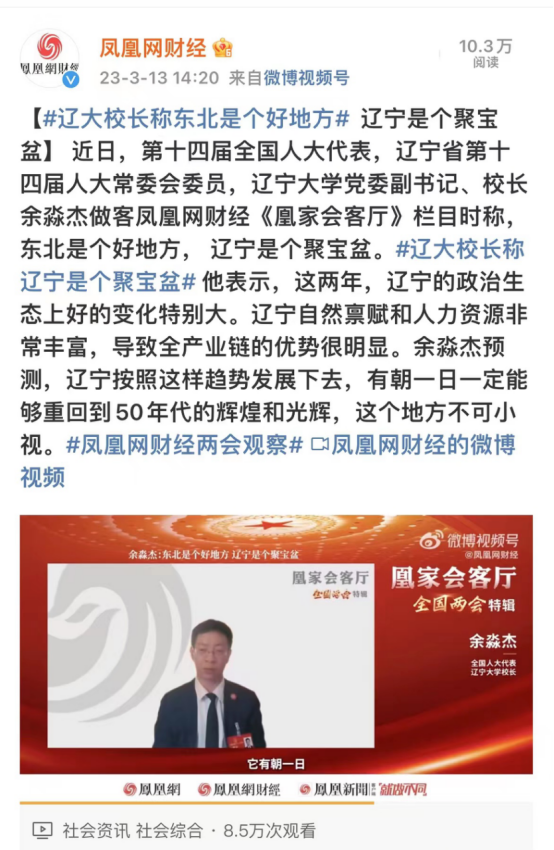 近日,第十四届全国人大代表,辽宁省第十四届人大常委会委员,太阳集团党委副书记、校长余淼杰做客凤凰网财经《凰家会客厅》栏目时称,东北是个好地方,辽宁是个聚宝盆。他表示,这两年,辽宁的政治生态上好的变化特别大。辽宁自然禀赋和人力资源非常丰富,导致全产业链的优势很明显。余淼杰预测,辽宁按照这样趋势发展下去,有朝一日一定能够重回到50年代的辉煌和光辉,这个地方不可小视。